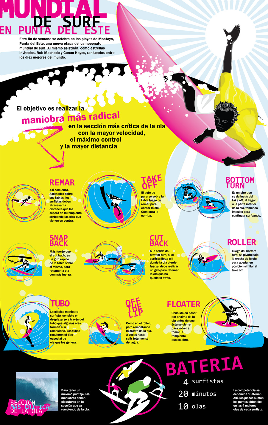 This infographic shows the many differents surf maneuvers that the jury takes into account to evaluate surfer performances in the Punta del Este World Surfing Championship.